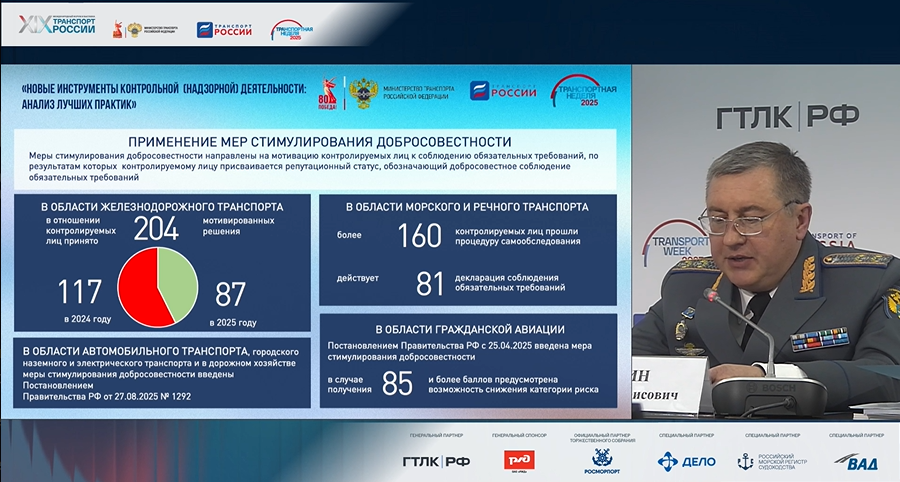 Такие меры два года уже применяются в области железнодорожного транспорта и в области морского и речного транспорта. На сайте Ространснадзора реализован сервис прохождения самообследования и оценки добросовестности контролируемых лиц, мотивированных решений о соответствии критериям добросовестности. И я хочу отметить, что перечень добросовестных лиц на железнодорожном транспорте постоянно расширяется. В области морского и речного транспорта свыше 160 контролируемых лиц прошли процедуру самообследования.