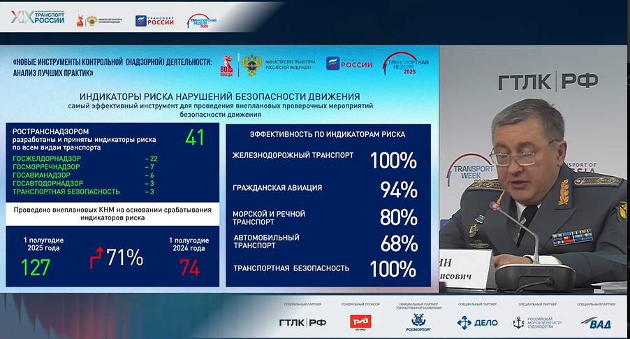 На постоянной основе нами ведётся учёт срабатывания индикаторов риска и организуются соответствующие внеплановые проверочные мероприятия. Так, за первые полгода этого года Ространснадзором на основе срабатывания индикаторов риска нарушения обязательных требований проведено 127 контрольно-надзорных мероприятий, что на 71% больше аналогичного периода прошлого года. Эффективность контрольно-надзорных мероприятий по срабатыванию индикаторов риска составляет 89 процентов. То есть при 89 процентах проверок мы выявляем нарушение обязательных требований.