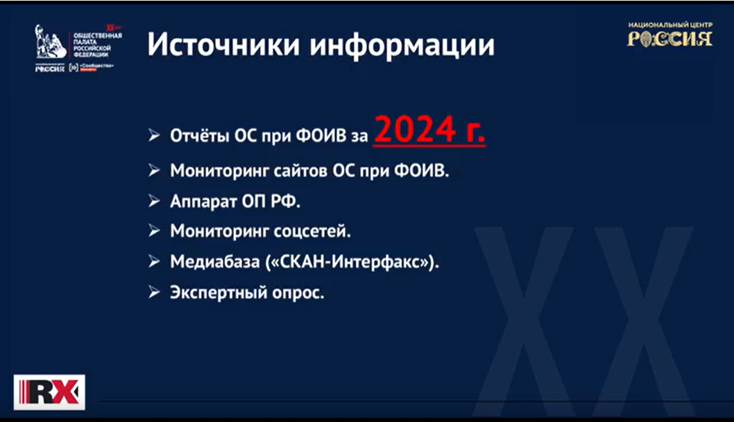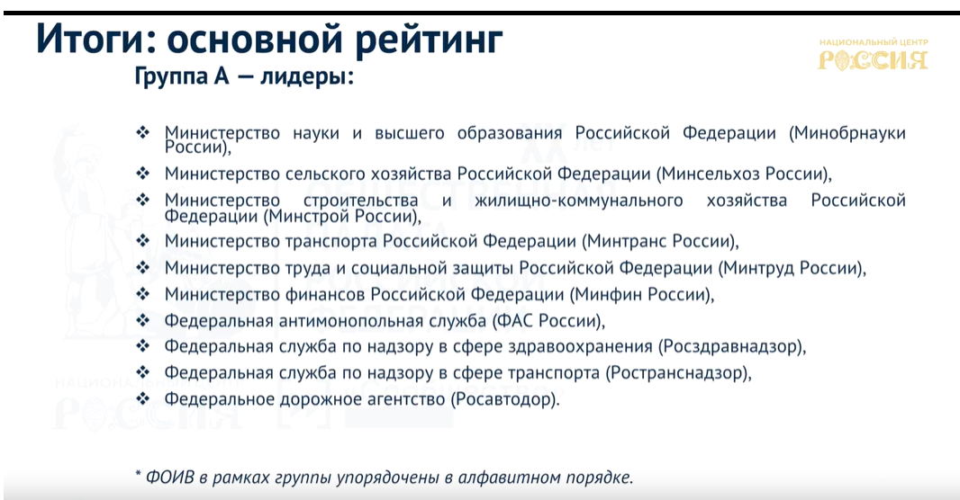 Были представлены результаты за 2024 и 2025 годы, демонстрирующие общий положительный тренд по большинству направлений. Небольшое снижение отмечено в сфере «публичности» (медийной активности), что, по мнению докладчика, связано с ростом медийной активности самих федеральных органов исполнительной власти.