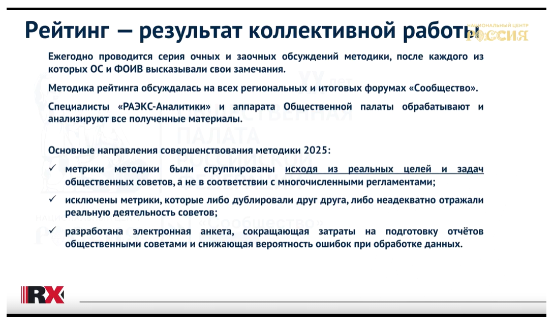 Общественная палата осуществляла контроль за методологией и результатами рейтинга. Особое внимание было уделено консультациям с представителями различных общественных советов, что позволило значительно улучшить методологию и сделать рейтинг более объективным. По сути, это уже не рейтинг проекта, а рейтинг самих общественных советов, результат их коллективного творчества.