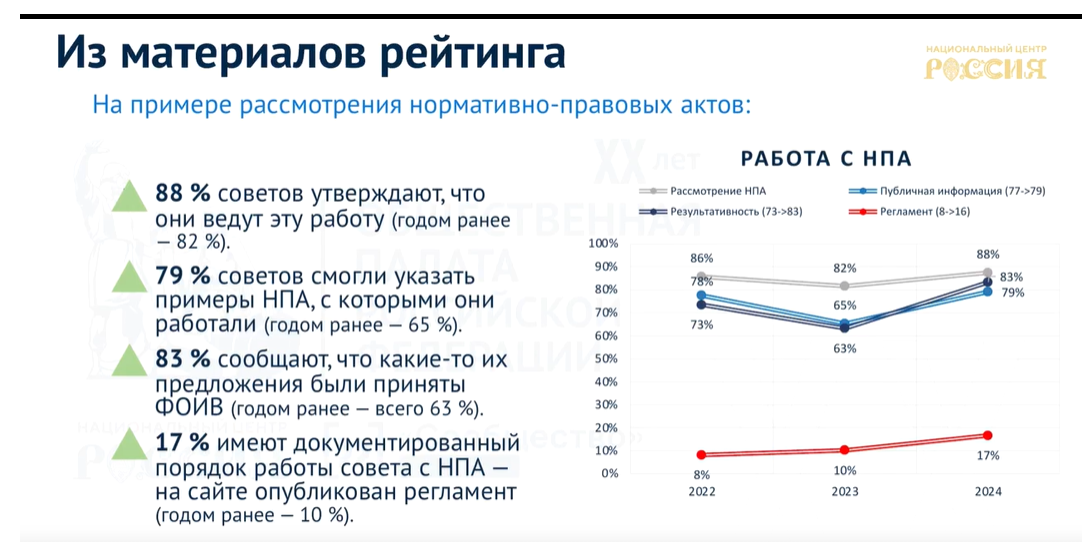 Несмотря на высокие показатели по большинству критериев (в диапазоне 79-88%), было отмечено, что лишь 17% общественных советов имеют документированный и публичный порядок работы с нормативными актами. В качестве положительного примера был приведен Общественный совет при Минстрое России, где отслеживается весь путь предложений, поступающих от заинтересованных сторон.