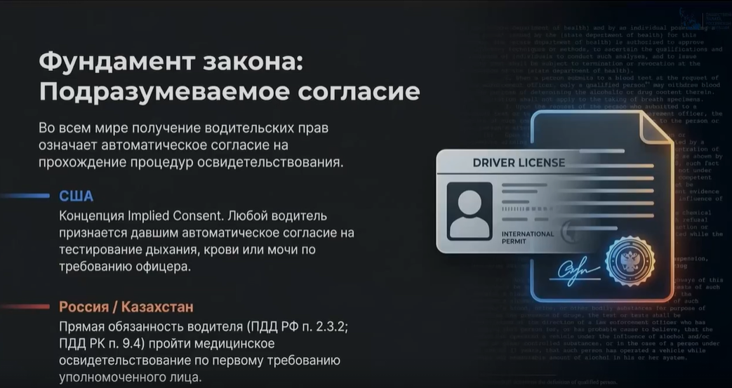 1.Согласие по умолчанию. Садясь за руль, водитель заранее соглашается на процедуру проверки. Если не хочешь, чтобы тебя проверяли на алкоголь или наркотики, — не садись за руль. Это первый тезис.