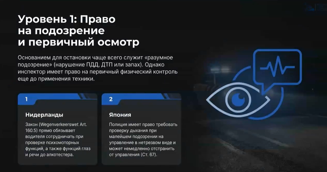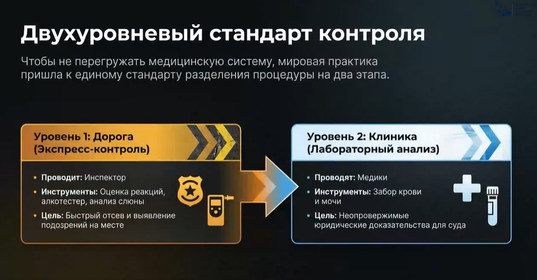 2. Двухуровневый контроль. Практически повсеместно в мире процедура строится по двухуровневой системе. Сначала — экспресс-контроль на месте. Его формы различаются: где-то это оценка реакции (например, в США могут попросить пройти по линии), где-то — алкотест (как в РФ), где-то — анализ слюны. Затем следует медицинское освидетельствование как более точный этап.