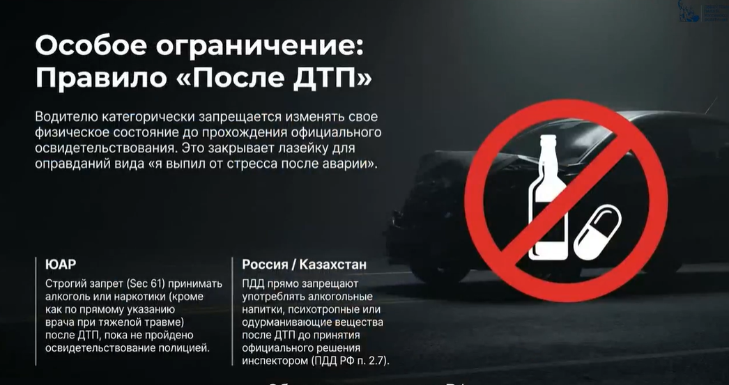 5. Запрет на употребление алкоголя после ДТП. Любопытно, что прямой законодательный запрет употреблять алкоголь после аварии до прохождения освидетельствования есть в РФ, Казахстане и, вероятно, в некоторых других странах. Хотя логически это подразумевается везде.