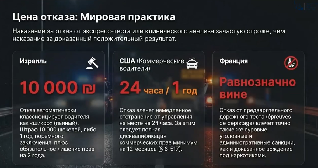 7. Цена отказа. Штрафы за отказ повсеместно высоки. Например, в Израиле штраф может достигать эквивалента 300-400 тыс. рублей, возможно и лишение свободы до года. Во Франции отказ часто приравнивается к езде в пьяном виде. В США для коммерческих водителей перевозящих людей, наказания могут быть строже.
