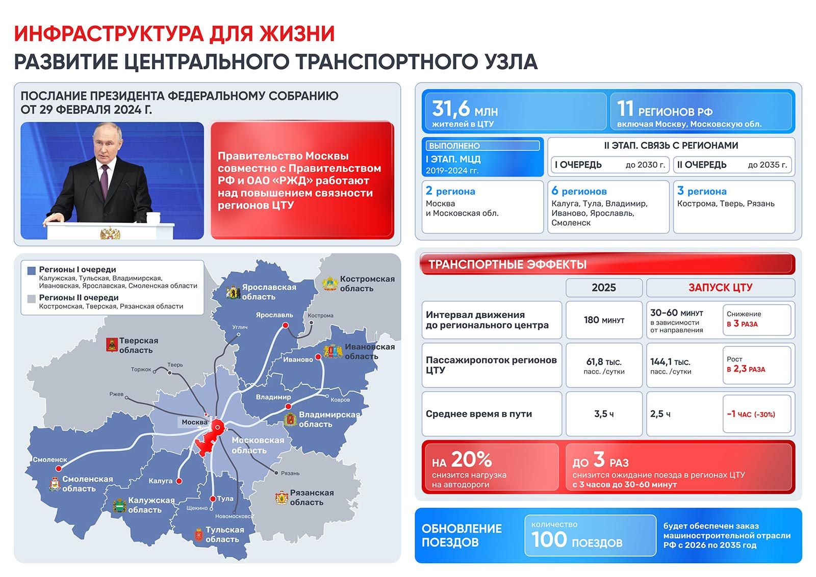 В рамках первой очереди программы до 2030 года планируется запуск дополнительных комфортных поездов в Калугу, Тулу, Владимир, Иваново, Смоленск и Ярославль. В рамках второй очереди — до 2035 года — улучшится железнодорожное сообщение между столичной агломерацией и административными центрами Костромской, Тверской и Рязанской областей.